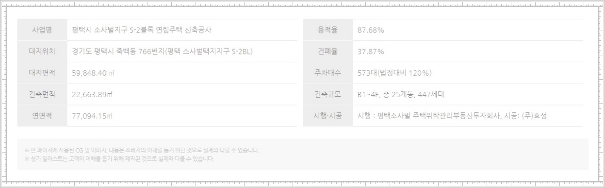 위치는 경기도 평택시 죽백동 766번지 이며 지하1층에서 지상4층까지 규모의 25개동으로 이루어진 총 447세대의 상품 입니다. 4Bay와 L/D/K 공간 강조가 돋보이는 3Bay의 구조를 갖추고 있으며 84㎡, 93㎡ 의 중소형 전용면적을 가지고 있습니다.